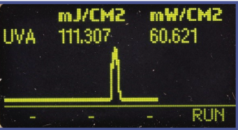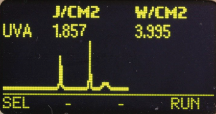 La pantalla del instrumento proporciona valores de irradiancia (W/cm2) y densidad de energía (J/cm2), así como el perfil de irradiancia.