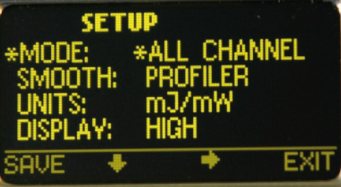 · Configuración: se utiliza para seleccionar opciones del instrumento, incluido el modo de visualización (gráfico, referencia, todos los canales), frecuencia de muestreo efectiva (suave), unidades (J/W, mJ/mW o μJ/μW) y brillo de la pantalla.